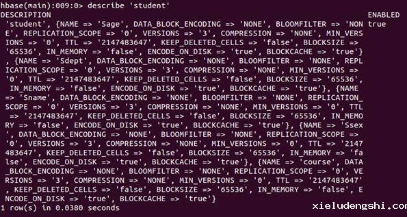 演示:HBase中创建表创建完“student”表后,可通过describe命令查看“student”表的基本信息。命令执行截图如下:
